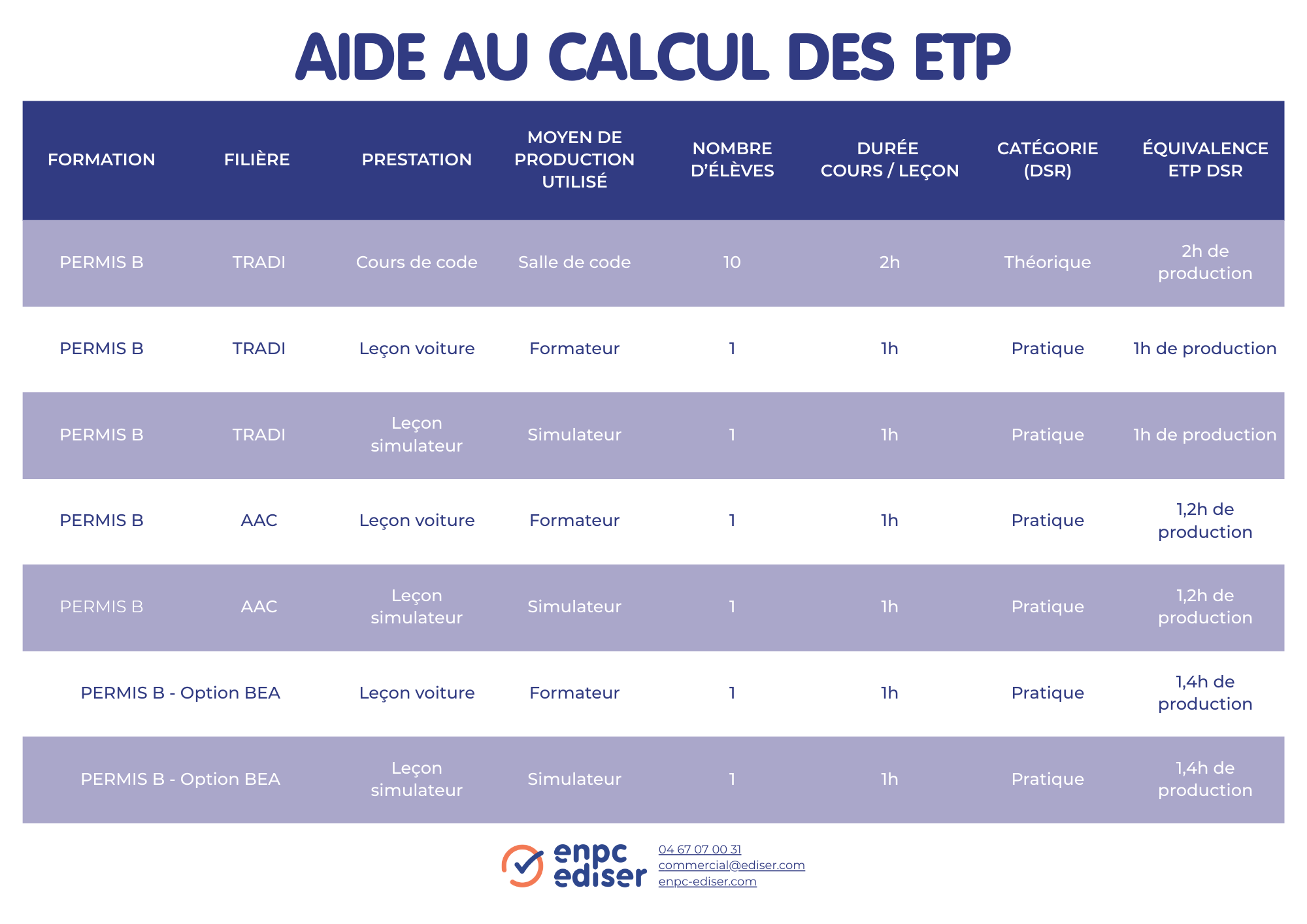 Seules les heures réalisées dans le cadre de la préparation d’un permis B ou moto sont prises en compte. Les leçons relatives aux passerelles, aux permis AM et au post-permis ne sont pas comptabilisées dans le calcul des ETP.