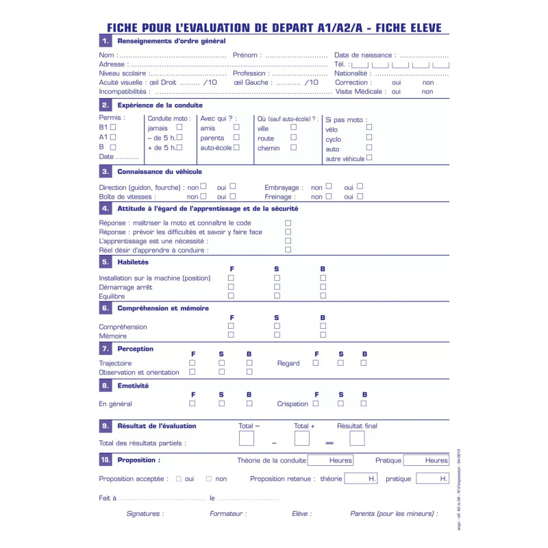 Fiches d’évaluation moto – Lot de 20 – Support pédagogique