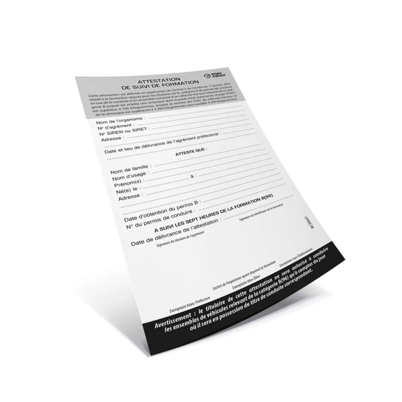 Ce lot comprend 20 attestations officielles BE/B96 destinées à valider la formation de 7 heures. Conformes aux exigences réglementaires, elles permettent de certifier la réussite de la formation pour la conduite de véhicules avec remorque.