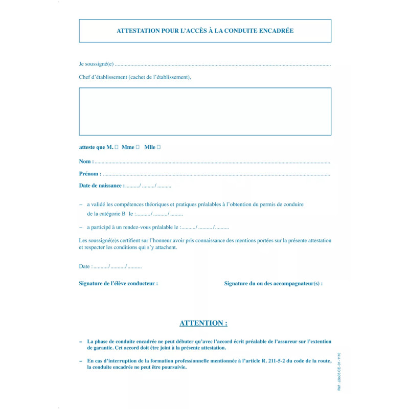Les attestations de conduite encadrée sont indispensables pour la validation des formations à la conduite encadrée. Vendues par lot de 20, elles garantissent la conformité réglementaire.