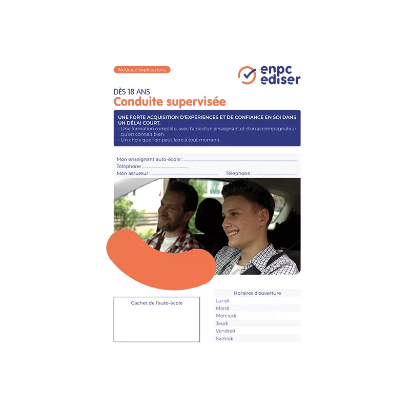 La notice d’explications conduite supervisée détaille les conditions, objectifs et règles de la conduite supervisée. Fournie par lot de 20 exemplaires, elle accompagne les auto-écoles dans la remise des documents pédagogiques.