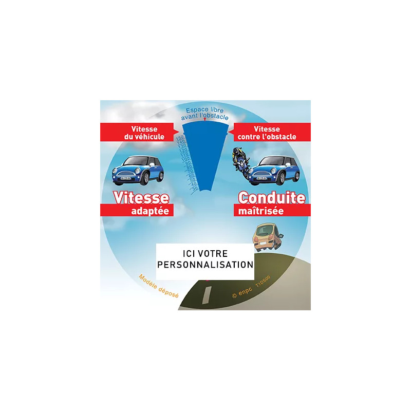 Le Disque Distances d’arrêt et de sécurité personnalisé reprend les principes pédagogiques essentiels tout en intégrant votre logo et vos couleurs. Un support visuel efficace pour sensibiliser vos élèves dans vos actions de formation.
