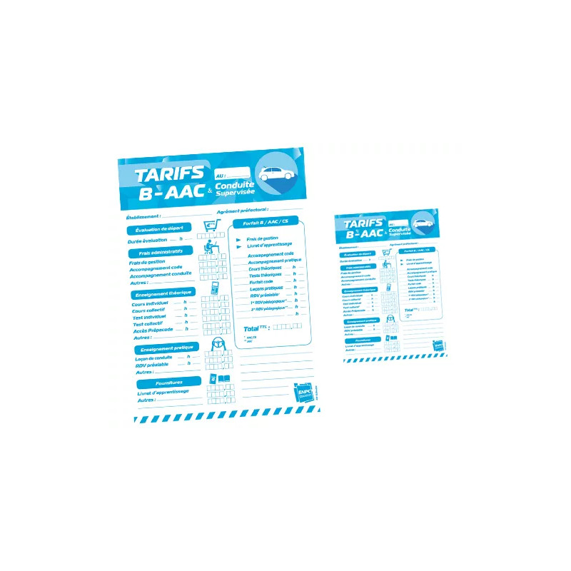 Ce lot de 2 cartes tarifaires permet d’afficher clairement les tarifs des formations B, AAC et CS à l’intérieur et en vitrine de votre auto-école. Il répond aux obligations légales de transparence et renforce la visibilité de votre établissement.