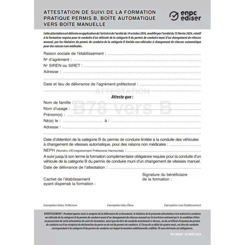 Ce lot de 20 attestations permet de valider la formation complémentaire autorisant la conduite d’un véhicule à boîte manuelle après obtention du permis B78. Document conforme aux exigences réglementaires et à fournir en fin de formation.