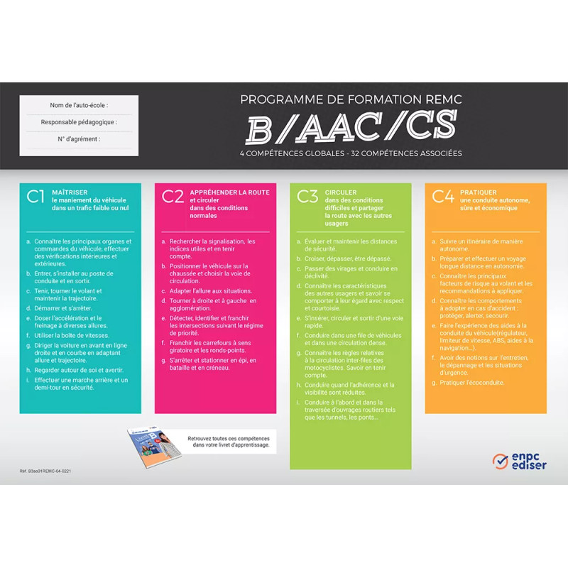 Cette version A3 de la carte REMC reprend les contenus essentiels du référentiel pour les formations B, AAC et CS. Compacte et claire, elle s’intègre facilement aux supports muraux ou aux espaces restreints des salles de code.