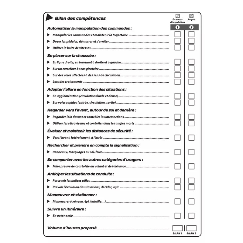 Les Bilans de compétences permettent aux formateurs d’évaluer les acquis et la progression des élèves tout au long de la formation. Imprimés sur papier de qualité, ils favorisent un suivi clair et structuré.