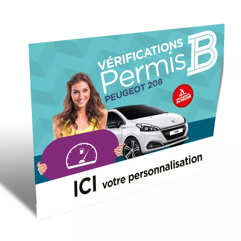 Ce livret reprend les vérifications techniques et questions orales de l’examen du permis B pour la Peugeot 208. Il est personnalisable avec le logo et les coordonnées de l’établissement.