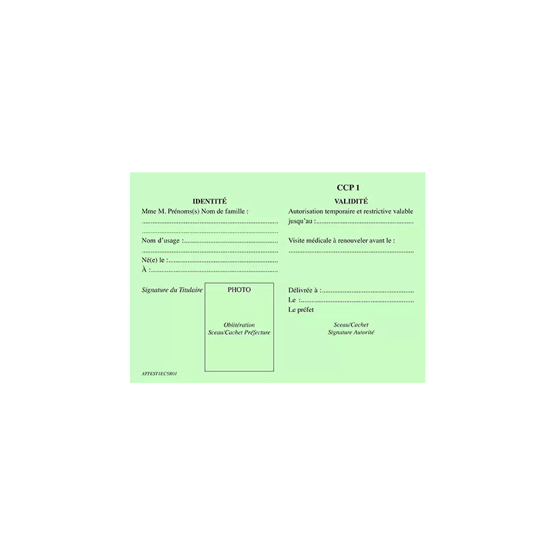 Les Attestations CCP1 permettent de valider la réussite du premier certificat de compétences professionnelles du titre ECSR (Enseignant de la Conduite et de la Sécurité Routière). Livrées par paquet de 50, elles sont conformes au format officiel et indispensables à la gestion administrative des examens.