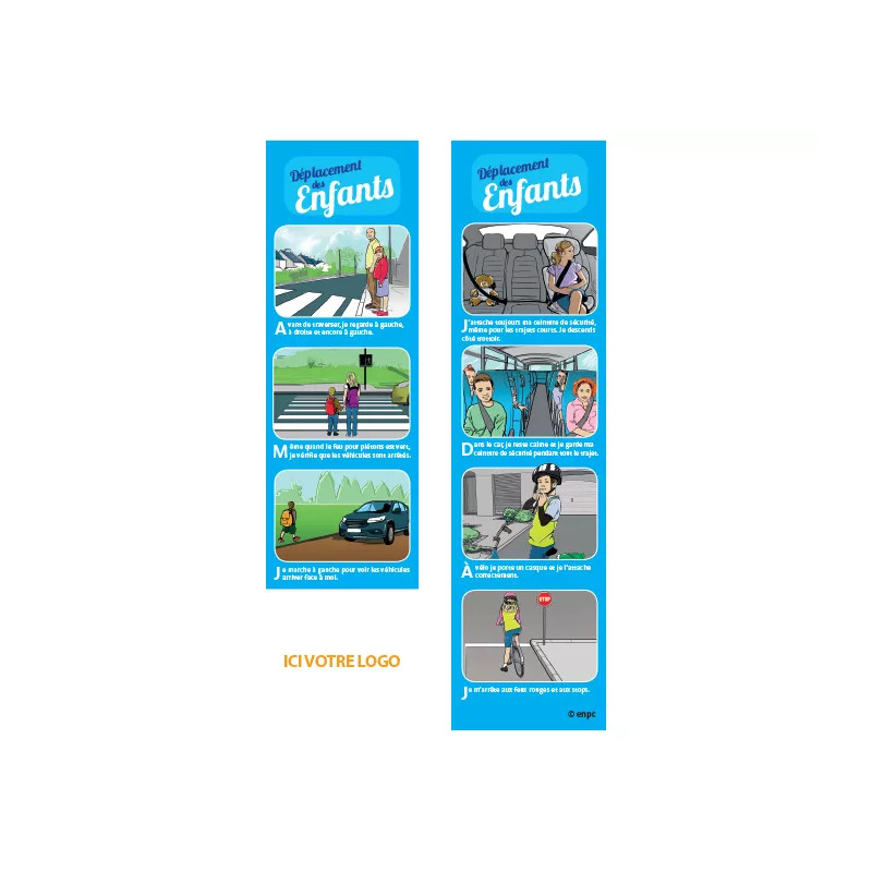 Le marque-page déplacement enfant personnalisé sensibilise les plus jeunes aux bons comportements lors de leurs trajets à pied, à vélo ou en voiture. Personnalisable au logo de votre structure, il allie pédagogie et visibilité.