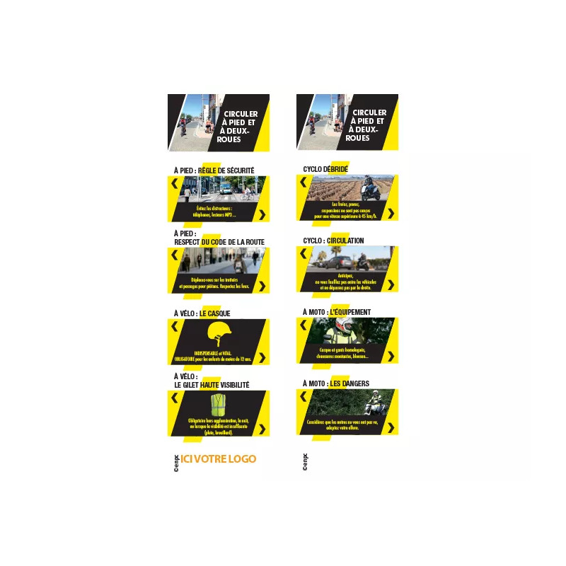 Le marque-page prévention usagers vulnérables sensibilise les piétons et cyclistes aux règles de prudence essentielles. Outil idéal pour les écoles, collectivités et associations, personnalisable à vos couleurs.