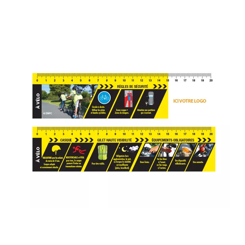 La règle prévention vélo personnalisable illustre les équipements obligatoires, la signalisation et les bons réflexes du cycliste. Un outil de sensibilisation ludique et pratique pour les plus jeunes.