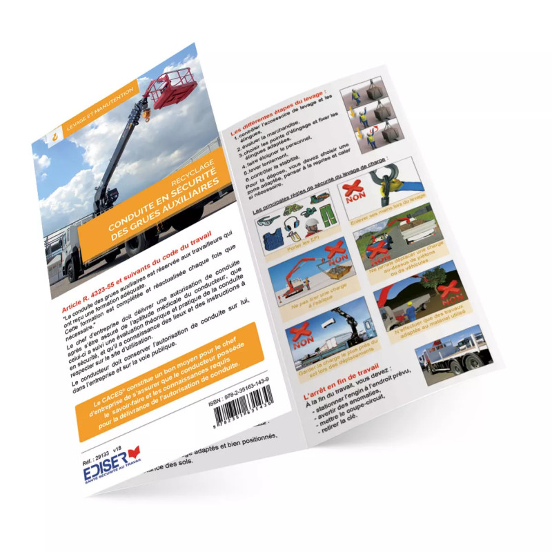 Ce dépliant grues de chargement R.490 présente toutes les informations utiles à la formation CACES®. Il couvre les vérifications préalables, les consignes de sécurité, les risques liés à l’utilisation des grues de chargement et les bons réflexes en cas d’incident. Sa présentation claire et synthétique en fait un support incontournable pour les centres de formation et les stagiaires.