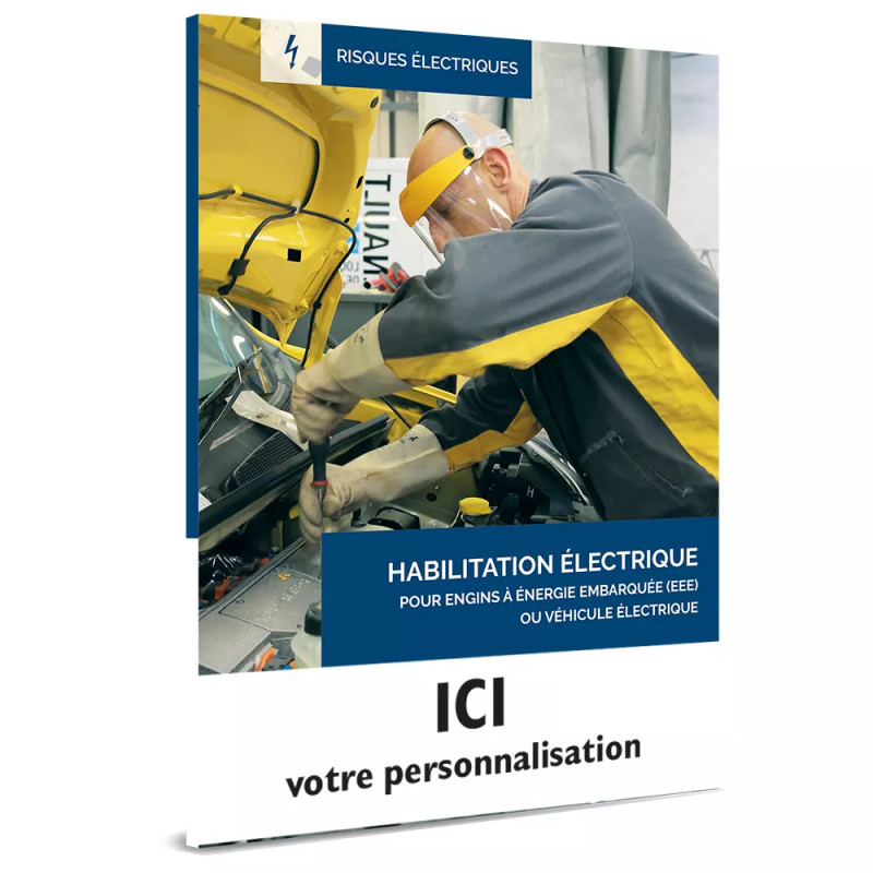 Ce livret reprend les règles d’habilitation électrique spécifiques aux véhicules électriques et hybrides. Il s’adapte aux procédures internes et au logo de votre organisme pour des formations sur mesure et conformes à la réglementation en vigueur.