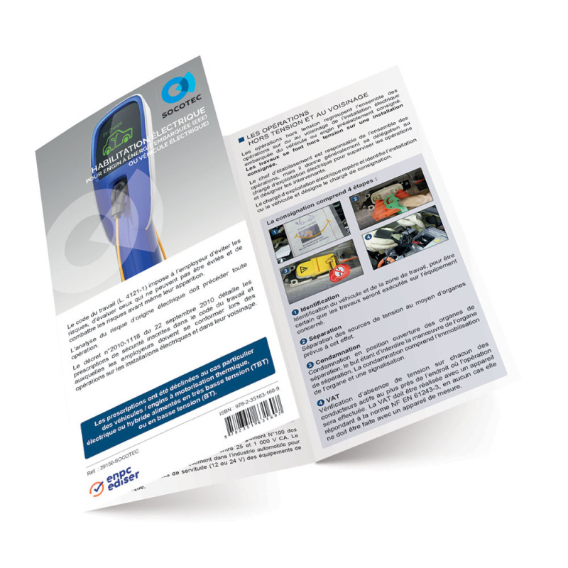 Le dépliant habilitation électrique - SOCOTEC est un support pédagogique synthétique conçu pour accompagner les formations et sessions de recyclage en habilitation électrique. Compact et immédiatement opérationnel, il regroupe l’essentiel des notions clés pour faciliter la compréhension et la mémorisation des stagiaires.