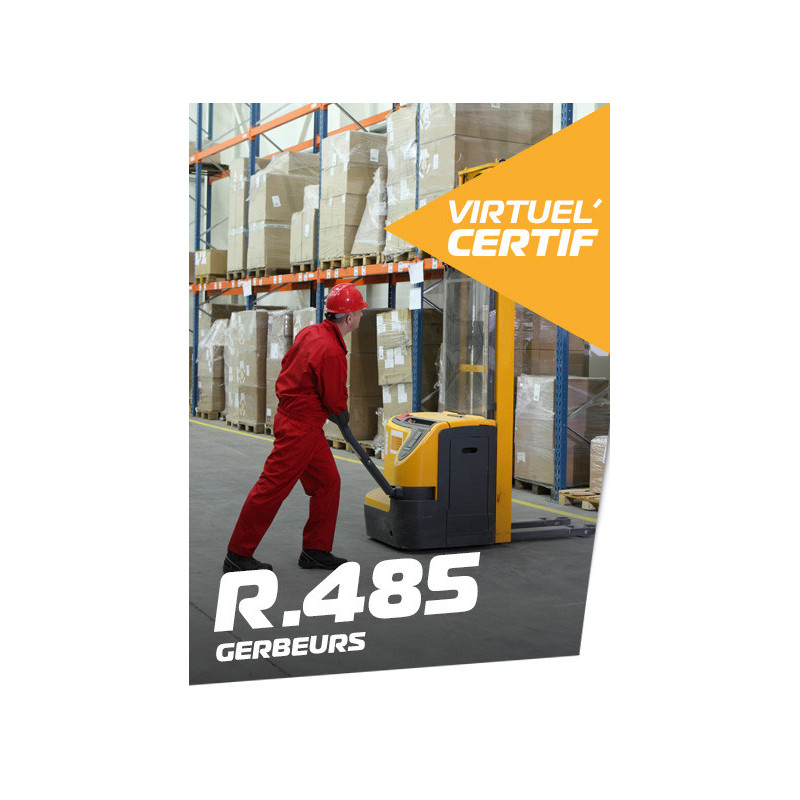 Le Virtuel'Certif R485 propose 5 séries de 100 questions illustrées issues de l'INRS pour la préparation à la conduite de gerbeurs à conducteur accompagnant. Ce module interactif est disponible exclusivement via la solution Virtuel’Box.