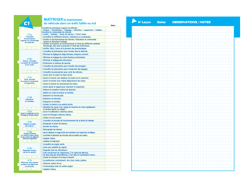 - A la fin de la fiche : Des questions de vérifications du véhicule, ainsi que les témoins du tableau de bord. Des cases pour les renseignements sur les rendez-vous préalable et pédagogiques obligatoires selon le permis choisi, et pour les renseignements sur les examens pratiques. Une page bilan des compétences avec 2 évaluations possibles. Un CEPC pour faire un examen blanc dans les conditions de l'examen réel et la suite du calendrier de l'activité pratique de l'élève.