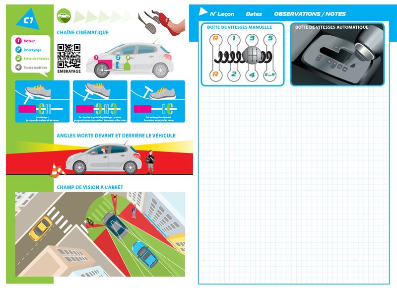- A l’intérieur, les 4 compétences globales et les sous-compétences : Sur chaque page de gauche sont inscrites les compétences. Des schémas pédagogiques complémentaires et des QR Codes sont intégrés. Une page entière est notamment consacrée au carrefour à sens giratoire. Pour une utilisation simplifiée du REMC, l’enseignant peut cocher les compétences associées (abordées, traitées et assimilées). Il indique la date à laquelle l’élève est en mesure d’évaluer les risques et de s’autoévaluer. Sur chaque page de droite se trouvent des espaces d’observations et de prises de note.