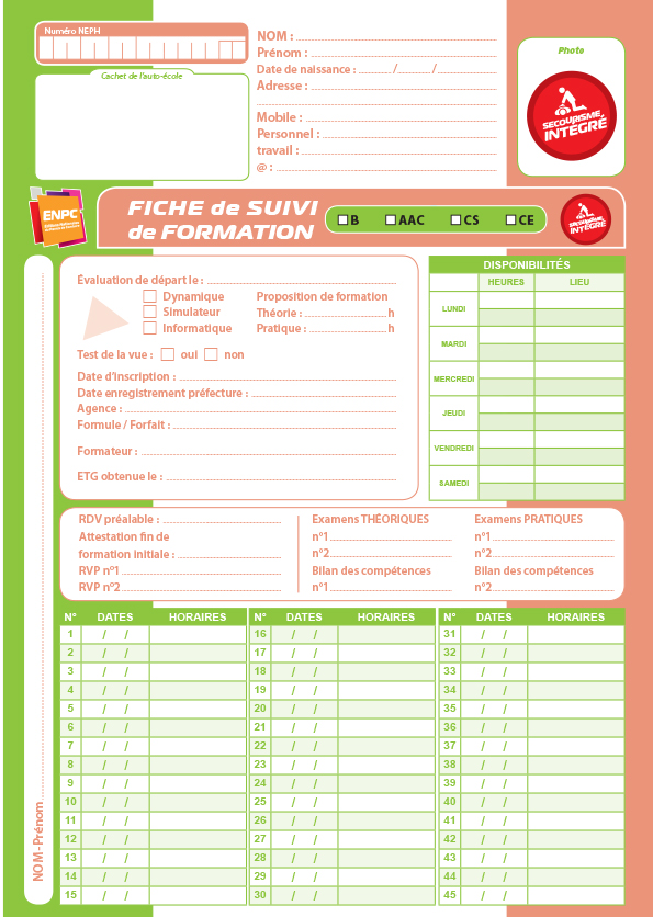 - Sur la première page, l'identité complète de l'élève et son activité au sein de l'auto-école : Catégorie de permis, évaluation de départ, RDV préalable, AFFI, RDV pédagogiques, examens théoriques et pratiques, le calendrier de son activité pratique, ses disponibilités. Pour un classement des fiches en portrait ou en paysage, le nom et le prénom de l'élève peuvent être inscrits dans une case spéciale afin de faciliter le classement de la fiche.