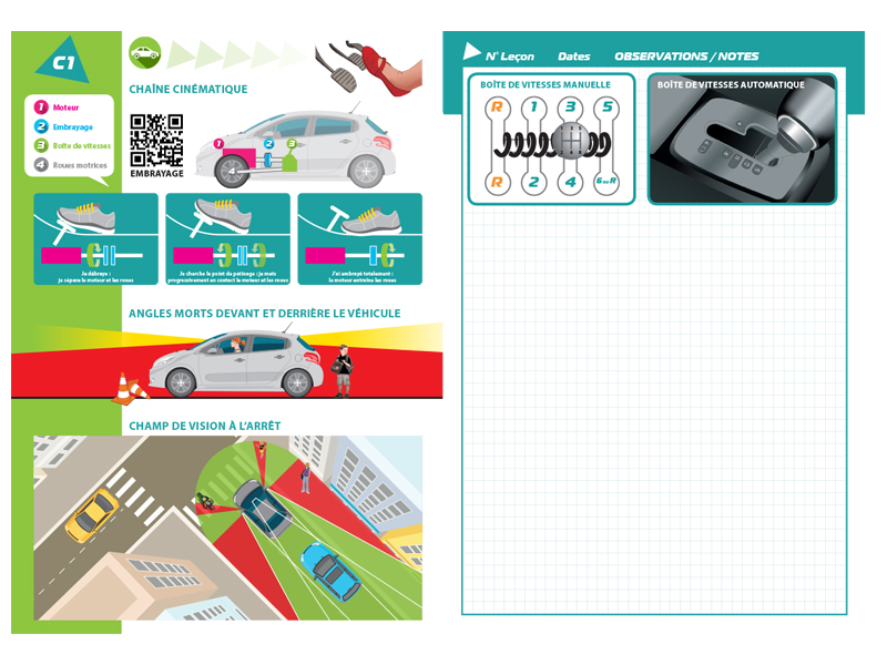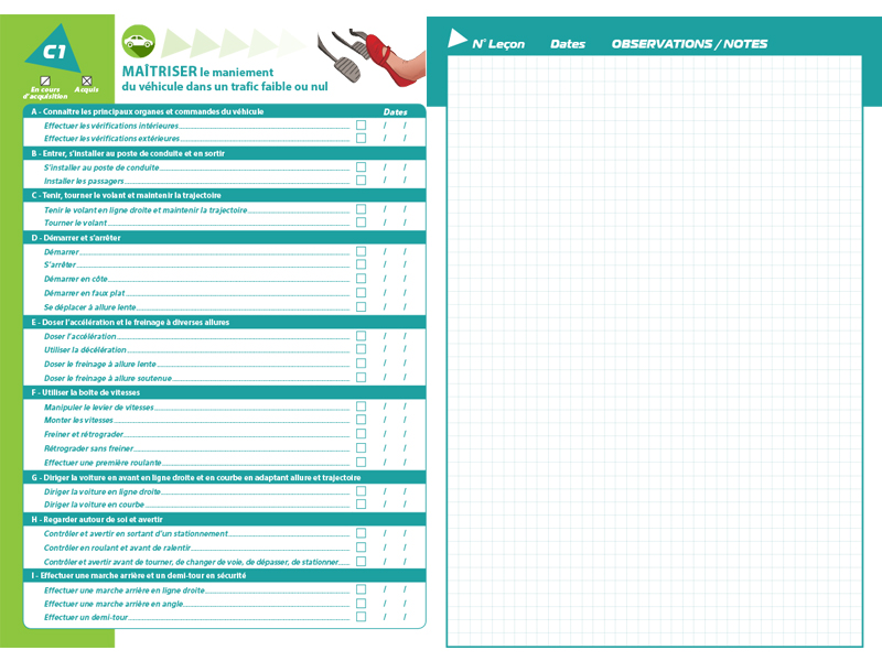 Sur chaque page de gauche, l'ensemble des compétences est détaillé. Des schémas pédagogiques complémentaires et des QR Codes sont intégrés après chaque compétence. Une page entière est notamment consacrée au carrefour à sens giratoire. Pour une utilisation simplifiée du REMC, l’enseignant peut cocher les compétences associées (abordées, traitées et assimilées). Il indique la date à laquelle l’élève est en mesure d’évaluer les risques et de s’autoévaluer.