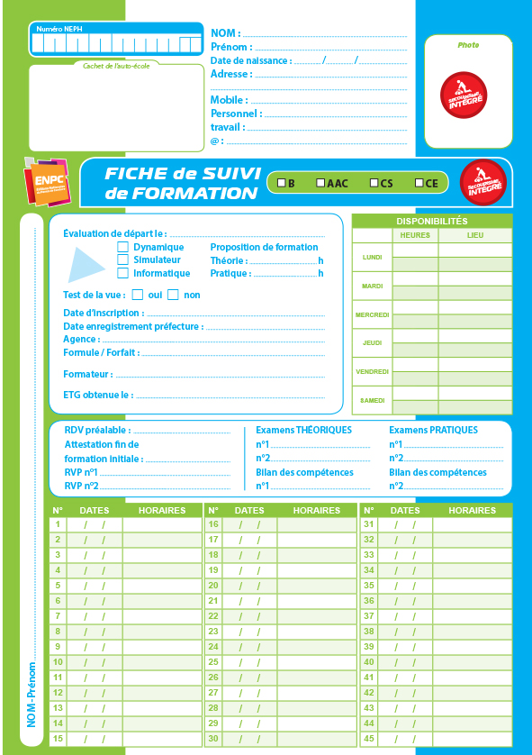 - Sur la première page, l'identité complète de l'élève et son activité au sein de l'auto-école :